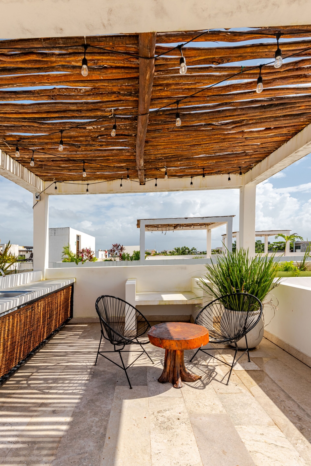 Located in the vibrant La Veleta neighborhood of Tulum. With easy access via a newly paved street, it’s a great spot for those arriving by car or scooter. Just steps away you’ll find an array of restaurants, coffee shops, ice cream parlors, boutiques, and a lively nightlife scene. This apartment is designed for both relaxation and entertainment. It features a private bathroom, kitchen, a living room, a dining area, and a private terrace with a tub attached to the bedroom your own personal oasis