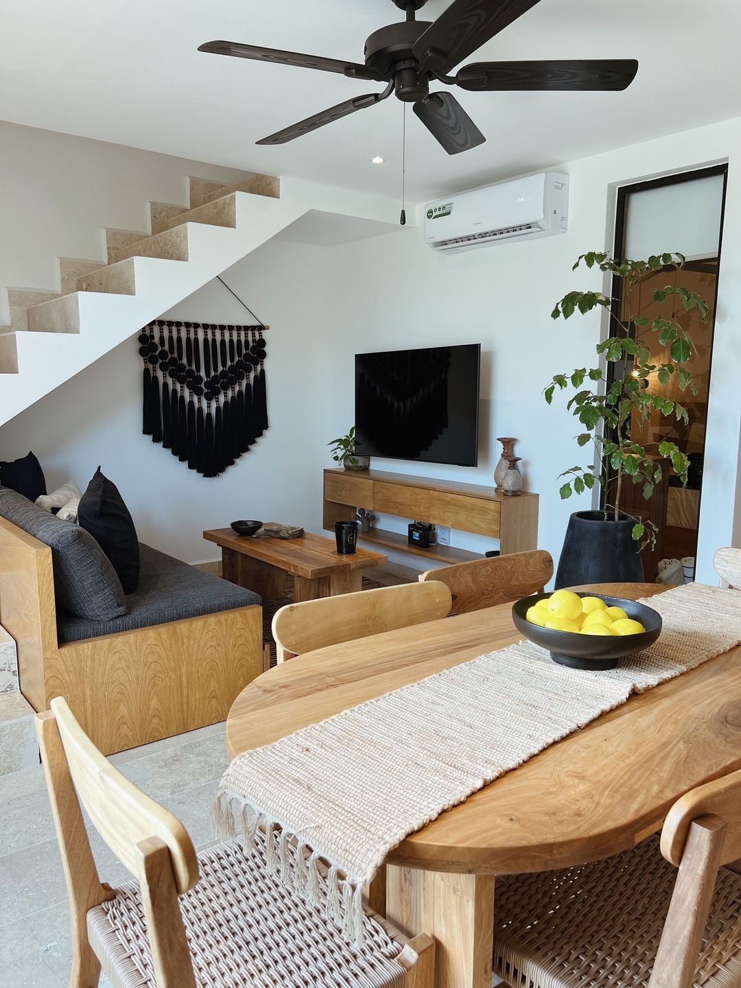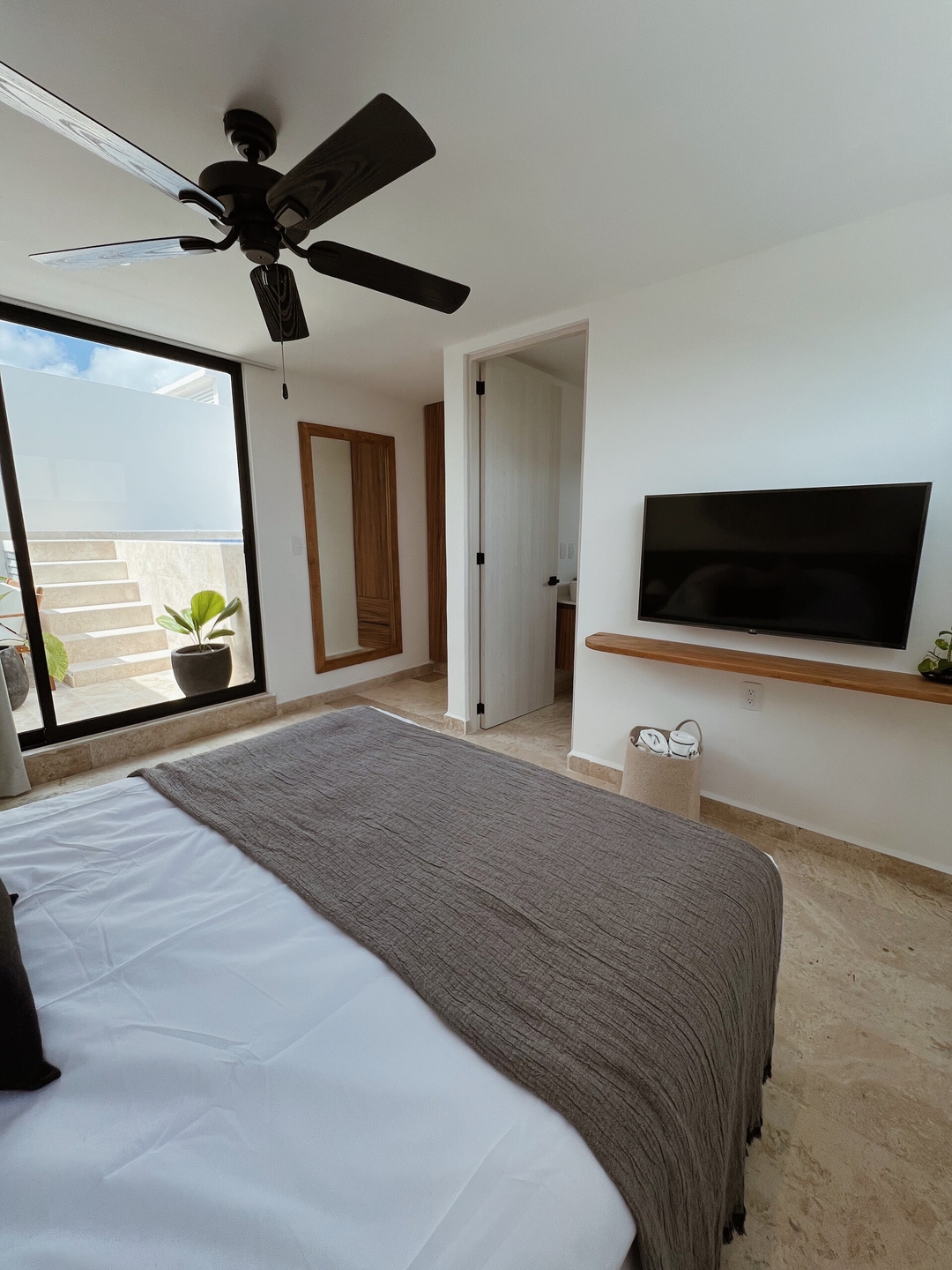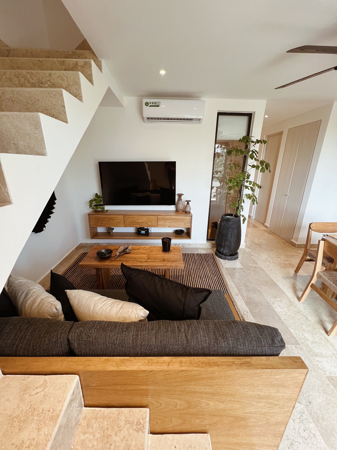 Este exclusivo penthouse en Aldea Zama Premium se distribuye en dos niveles. Al entrar, encontrarás la sala, comedor y cocina totalmente equipada, con acceso a una terraza con vistas a la selva. En esta planta hay una habitación con cama king size y baño privado. En la planta superior, está la segunda habitación y una terraza privada con alberca exclusiva, sala exterior y espacio para relajarte. Su diseño bohemio-moderno y ubicación privilegiada lo hacen único en Tulum.