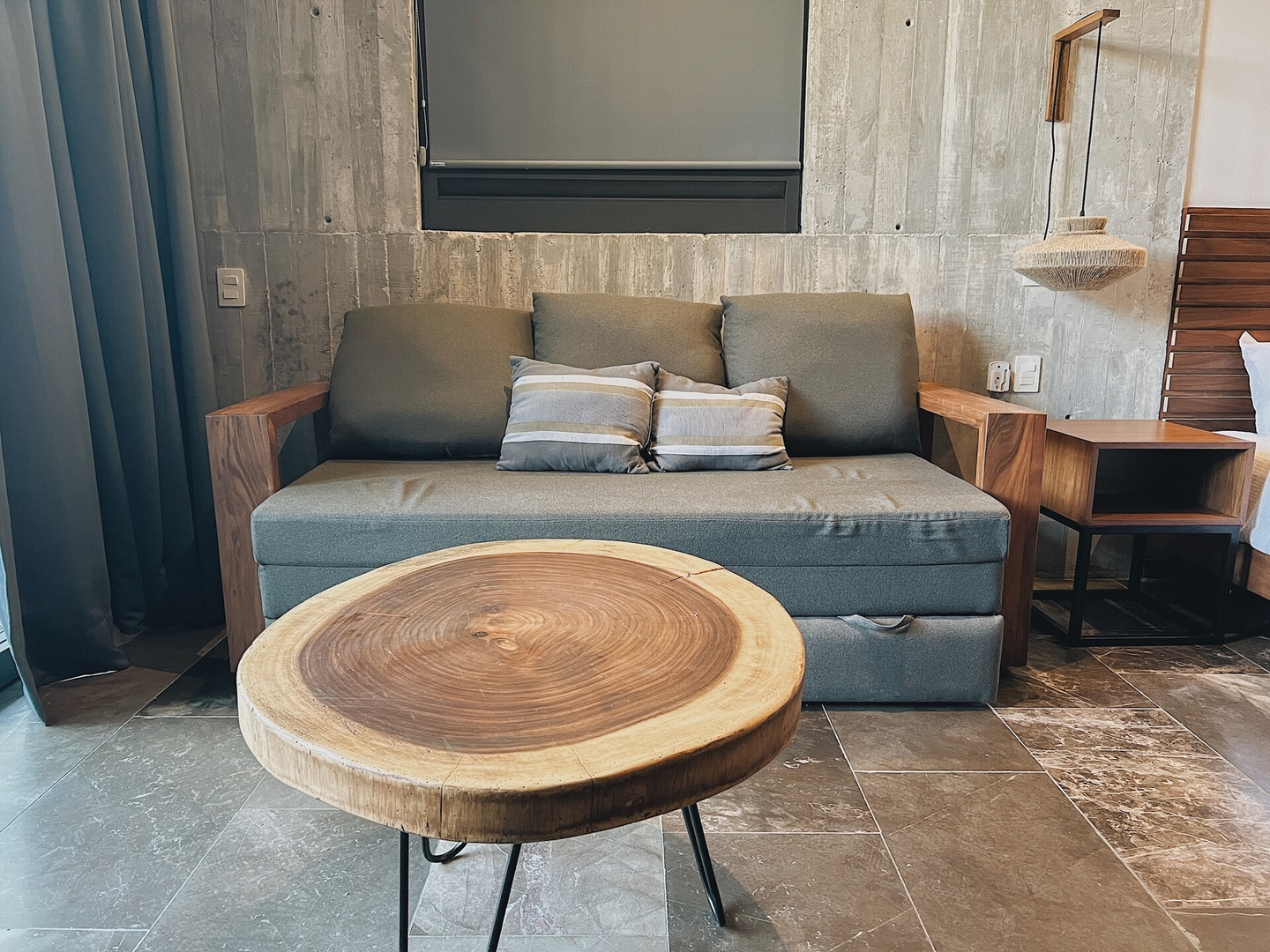 Este departamento tipo estudio se encuentra dentro de un complejo moderno en el tercer nivel, accesible por elevador y escaleras. Su distribución incluye un baño privado, cama king size, sofá cama matrimonial, cocina totalmente equipada, televisión y un balcón privado con comedor para cuatro personas. El aire acondicionado mantiene el espacio fresco en todo momento. El estilo del estudio es contemporáneo, con una decoración en tonos negros que resalta su elegancia y funcionalidad. Aceptamos niños y mascotas con un costo adicional.